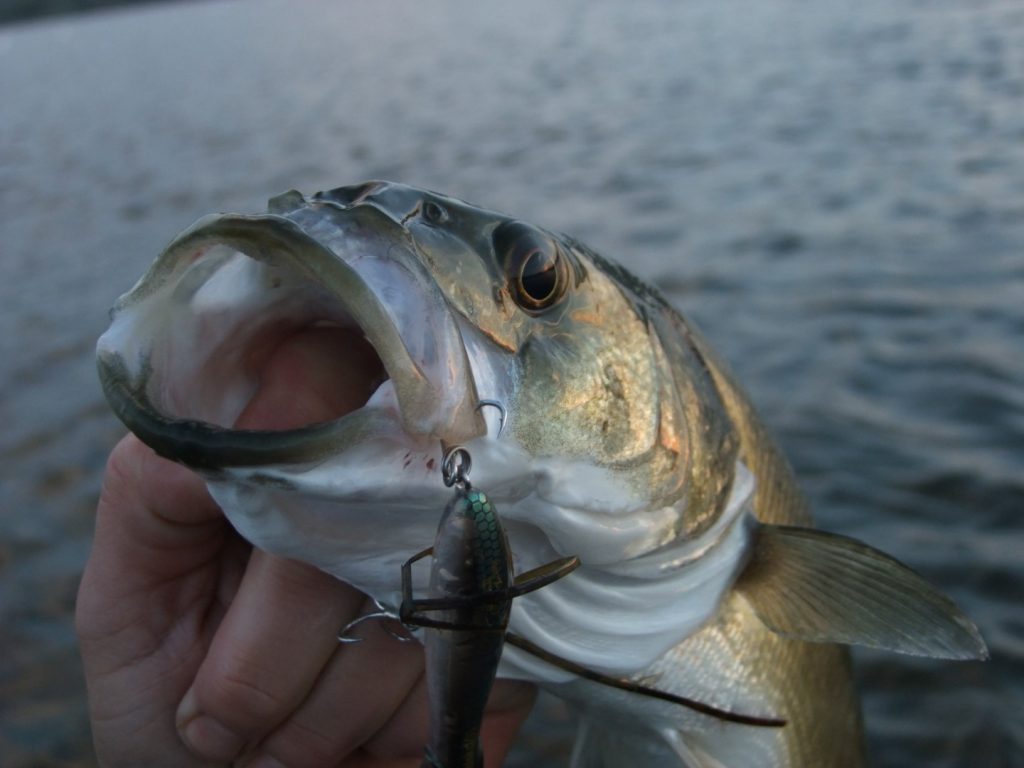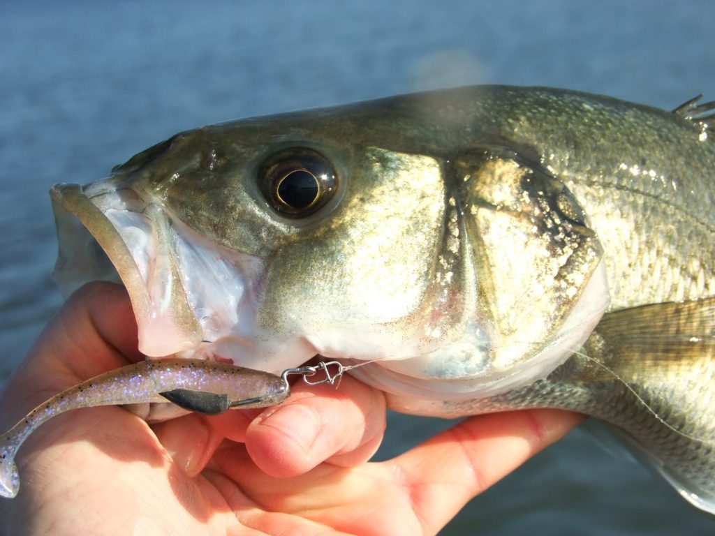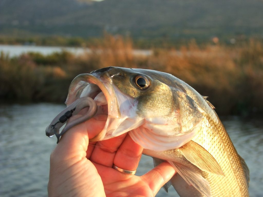 Nastavio sam optimistično s pretpostavkom da nisu jedini koji koriste podlokanu obalu kao savršen zaklon za zasjedu ili jednostavno traže rakove kojih na takvom terenu ima poprilično. I do sada sam ih nalazio na takvim mjestima, ali u većini slučajeva su bili mališani koji su napadali sve što im se ponudi pa sam brzo odustajao. Osim toga takvi i nisu baš diskretni i lako se uoči jato aktivnih malih razbojnika, ali ovaj put obala je bila tiha i nadao sam se da bih mogao isprovocirati još kakvu veću ribu na napad. Nastojao sam se kretati diskretno blizu obale da ne poplašim ribu. Iz belly boata se to može odraditi savršeno dok bi s obale bilo gotovo nemoguće. Kako bih izbjegao nepotrebno zapinjanje varalice u travu na obali (da ju otkvačim morao bih prići do same obale i poplašiti eventualnu lovinu) prebacio sam se na silikonce na weedless montaži i neopterećeno bacao u samu obalu između busenja trave očekujući reakcijske grizeve – ili će bubnuti odmah ili pobjeći glavom bez obzira. Ovo me podsjetilo na ribolov pastrve – precizni zabačaji ispod ruke pod granje ili među kamenje na suprotnoj obali. Pastrvska shema na moru – neočekivano, ali korisno i jako zanimljivo. Već desetak metara dalje pogađam lijepog brancina u glavu i ovaj reagira odmah i prije nego sam okrenuo ručicu. Privlačim ga lagano bez forsiranja nisko položenim štapom da ne izbije na površinu i ne radi previše buke. Konačno u podmetaču imam lijepu ribu od kojih 800 g. U sljedećih pola sata – sat pretražio sam cca 150 m takvog terena i dobio još nekoliko riba od pedlja do 500 g i baš svaki je napao u prvi metar povlačenja. Jedino su sitni po nekoliko puta kljucali dok se ne bi zakvačili ili odustali. Zanimljivo je da se cijelo to vrijeme nije mogla uočiti nikakva aktivnost ribe, iako je dubina rijetko prelazila pola metra. Koliko god diskretno odrađeno, ulov sedam-osam riba na malom prostoru je bilo dovoljno da sve stane pa sam se odlučio odmaknuti od obale i pokušati malo dalje površincima da bih se eventualno opet vratio kad se sve smiri.