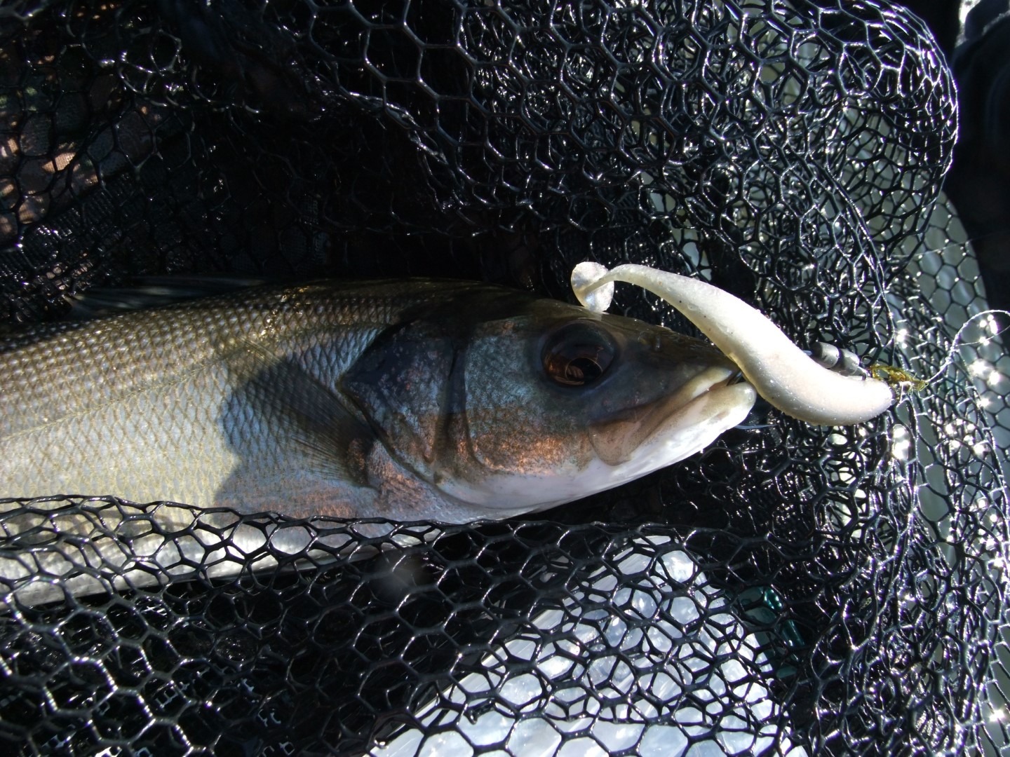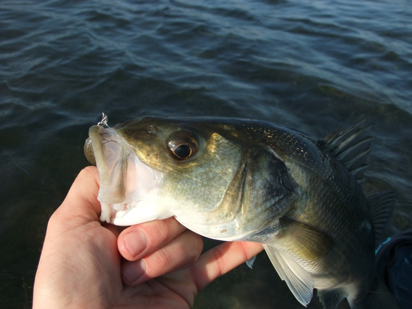 Nastavio sam optimistično s pretpostavkom da nisu jedini koji koriste podlokanu obalu kao savršen zaklon za zasjedu ili jednostavno traže rakove kojih na takvom terenu ima poprilično. I do sada sam ih nalazio na takvim mjestima, ali u većini slučajeva su bili mališani koji su napadali sve što im se ponudi pa sam brzo odustajao. Osim toga takvi i nisu baš diskretni i lako se uoči jato aktivnih malih razbojnika, ali ovaj put obala je bila tiha i nadao sam se da bih mogao isprovocirati još kakvu veću ribu na napad. Nastojao sam se kretati diskretno blizu obale da ne poplašim ribu. Iz belly boata se to može odraditi savršeno dok bi s obale bilo gotovo nemoguće. Kako bih izbjegao nepotrebno zapinjanje varalice u travu na obali (da ju otkvačim morao bih prići do same obale i poplašiti eventualnu lovinu) prebacio sam se na silikonce na weedless montaži i neopterećeno bacao u samu obalu između busenja trave očekujući reakcijske grizeve – ili će bubnuti odmah ili pobjeći glavom bez obzira. Ovo me podsjetilo na ribolov pastrve – precizni zabačaji ispod ruke pod granje ili među kamenje na suprotnoj obali. Pastrvska shema na moru – neočekivano, ali korisno i jako zanimljivo. Već desetak metara dalje pogađam lijepog brancina u glavu i ovaj reagira odmah i prije nego sam okrenuo ručicu. Privlačim ga lagano bez forsiranja nisko položenim štapom da ne izbije na površinu i ne radi previše buke. Konačno u podmetaču imam lijepu ribu od kojih 800 g. U sljedećih pola sata – sat pretražio sam cca 150 m takvog terena i dobio još nekoliko riba od pedlja do 500 g i baš svaki je napao u prvi metar povlačenja. Jedino su sitni po nekoliko puta kljucali dok se ne bi zakvačili ili odustali. Zanimljivo je da se cijelo to vrijeme nije mogla uočiti nikakva aktivnost ribe, iako je dubina rijetko prelazila pola metra. Koliko god diskretno odrađeno, ulov sedam-osam riba na malom prostoru je bilo dovoljno da sve stane pa sam se odlučio odmaknuti od obale i pokušati malo dalje površincima da bih se eventualno opet vratio kad se sve smiri.