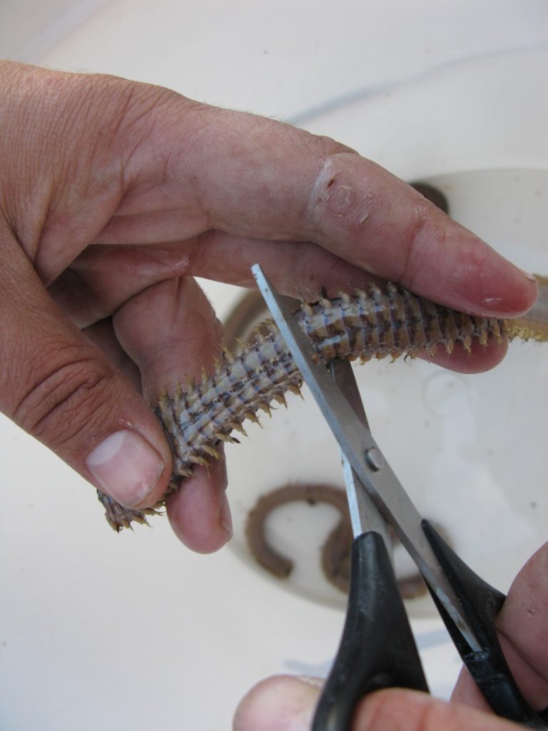 Koju, to jest kakvu ćemo opremu koristiti ovisi o terenu na kojem lovimo i koliko nam treba biti dug izbačaj. Osobno lovim na terenima koji ne iziskuju daleke zabačaje stoga koristim klasične špinerske štapove do 60-ak grama težine bacanja, dužine 2.70-3.00 metra i pripadajuće role veličine 4000 po Shimanu. No isto tako se mogu koristiti i štapovi za bolentino ili lakši surf štapovi, to je stvar osobnog odabira. U ovom ribolovu dajem prednost klasičnom najlonu jer lovimo na teškim terenima gdje je loša otpornost na abraziju upredenice velika mana. Uglavnom koristim najlone debljine 0.30 do 0.35 mm. Sistem je jednostavan, na glavni najlon montiramo klizno olovo željene težine, recimo od 40 do 80 grama, perlicu kao zaštitu čvora, virblicu i tada flurokarbonski predvez dužine oko 50 cm i debljine 0.25-0.30 mm. Možda se sve ovo čini malo predimenzionirano ali lovimo na teškim terenima, a uz to možemo i uloviti neku veću ribu poput orade, stoga nije na odmet imati malo reserve snage. Što se tiče udica najbolje su se pokazale udice u veličinama od 4 do 1 ovisno o veličini mamca i očekivane ribe.-
