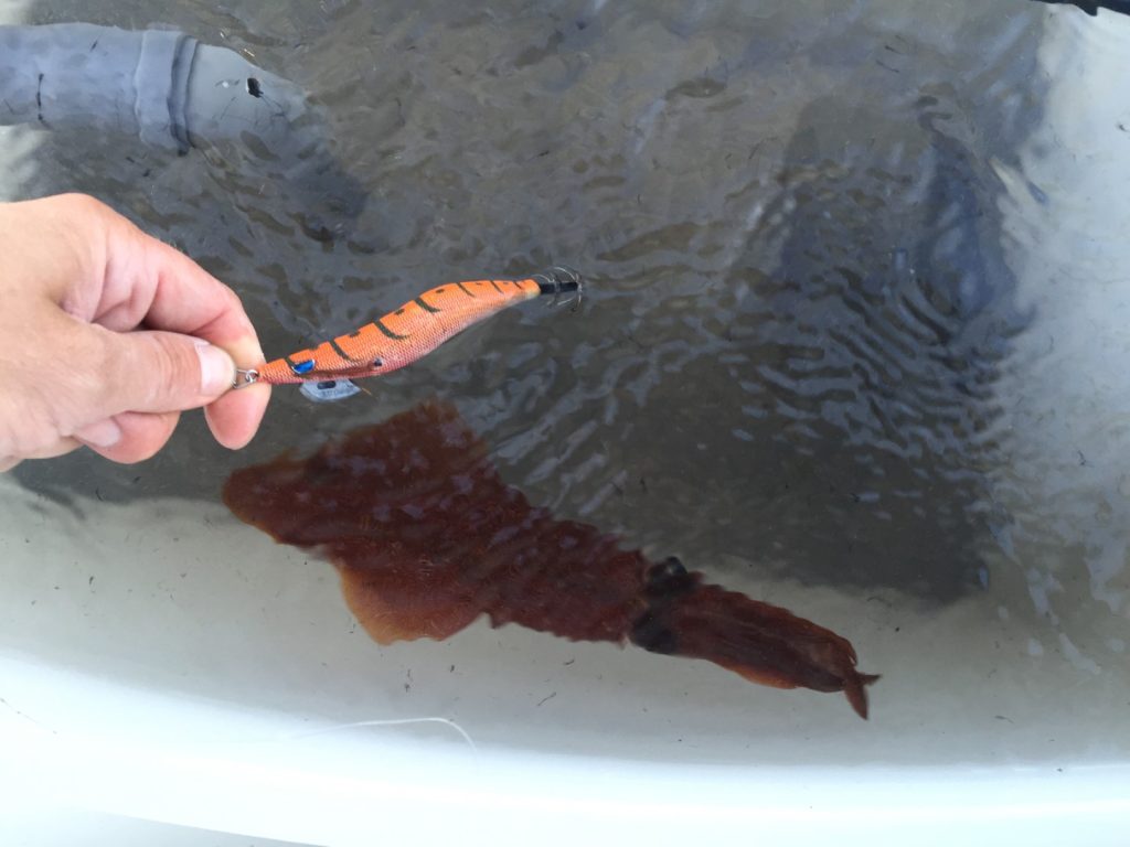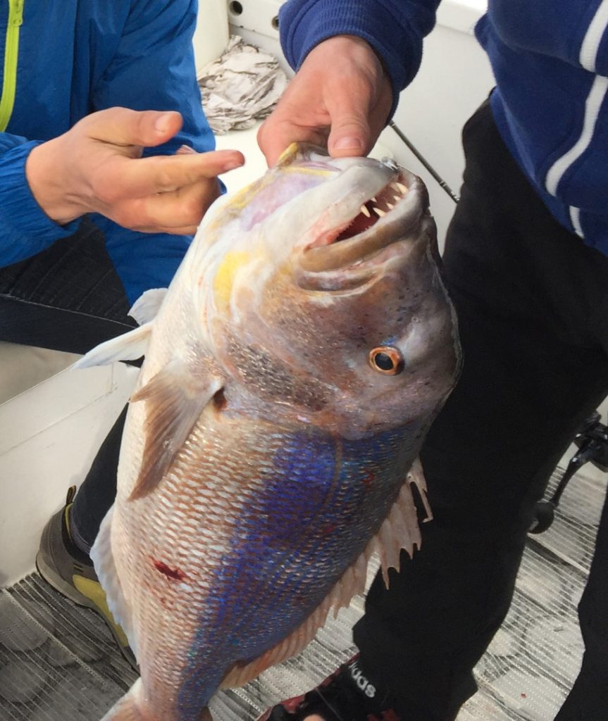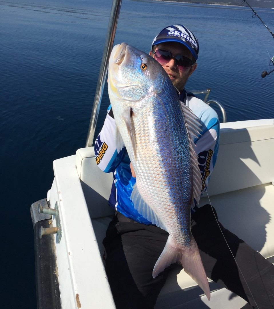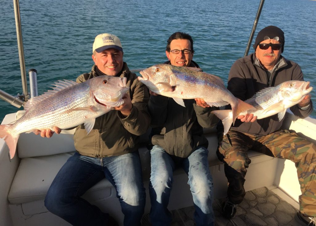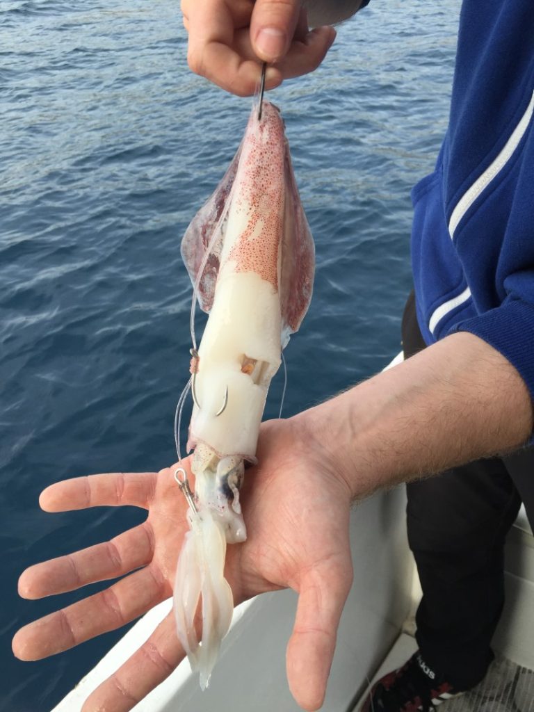 Motorom smo zavezli da ga u svemu tome odlijepimo od dna, dovlačimo predivnog macana do gumenjaka, s niskog tubusa mu guram ruku u škrge i napokon je riba u brodu. Procjenjujemo ga na nekih 5,5 kg i slikamo se za gušte, mi smo svoje odradili. Doduše, bilo bi lipo da doma ponese svatko svoju ribu, što znači da nam treba još jedan. Međutim, sad se malo igramo, pa pored raspoloživih živih liganja nadivamo krepanu. Još smo se malo izvrtili oko vrha, a onda krenuli niz padinu prema drugoj glavici. Nekih 150 m od ovog vrha je drugi vrh („glavica“) dubine 16 m. Spustit ćemo se s ovog braka prema drugoj glavici, proći kroz sedlo između njih i onda pokušati navući koju ribu za sobom, pa isprovocirati u penjanju na tu drugu glavicu. Mrtva lignja pomalo leluja iznad dna, vidimo neku ribu na 20-tak metara, povlačimo ju vjerojatno za sobom jer na samom vrhu na nekih 17 m Grgi udara novi zubac! Nakon školske kontre riba je zakvačena i pošteno se bori, Grga mi govori da se mora skroz vratiti na ručnu panulu jer je deset puta veći gušt nego sa štapom, a više od godinu dana je forsirao samo štap. „Ajde ti izvuci ovog pa ćemo lako dalje“ – govorim mu dok dajem gasa na penti da ribu odlijepimo od dna. Dobro je zakvačen i brzo dolazi do broda, ipak je ulovljen plitko pa nema puno najlona za izvlačiti. Po kilaži brat onom ranijem, obradovao nas je pošteno. Svako ima svoju ribu i možemo mirno na marendu i kupanje. Nismo davno ribu plitko lovili, ima to posebne draži. Povukli smo od jednog vrha kroz sedlo do drugog, i taj manevar je u toj putanji povukao ribu za sobom, ribu koja na vrhu nije izdržala da ne udari. A bez takvih improvizacija, s klasičnim povlačenjem po izobati od 25 m, vjerojatno to burnje jutro ne bismo digli ribu.