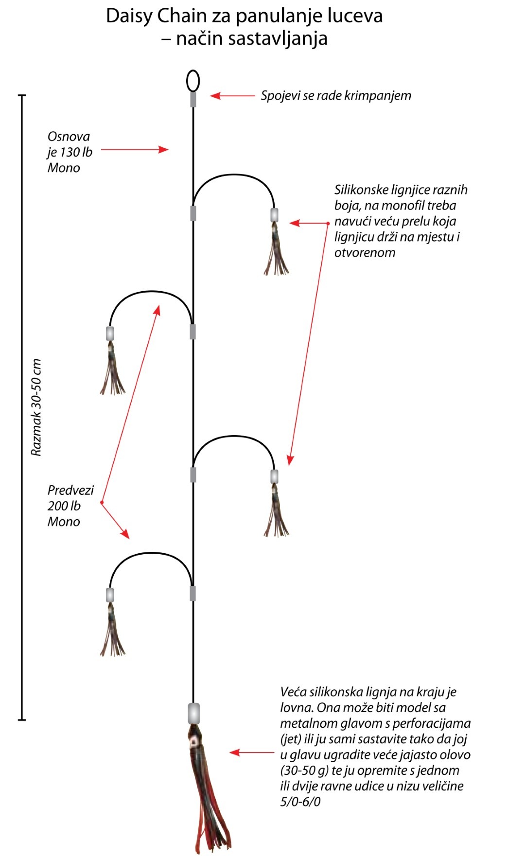 - Silikonske lignjice raznih boja, na monofil treba navući veću prelu koja lignjicu drži na mjestu i otvorenom