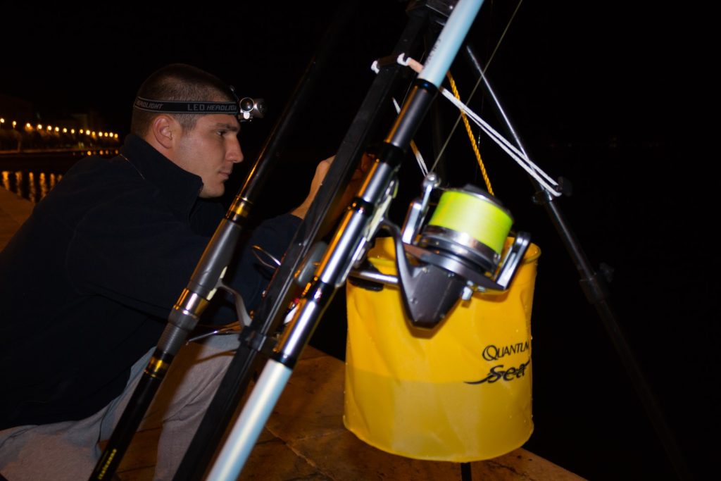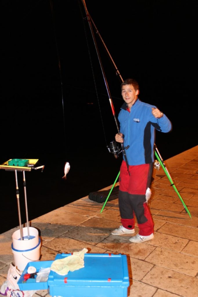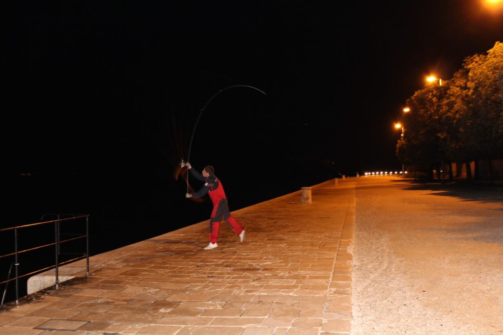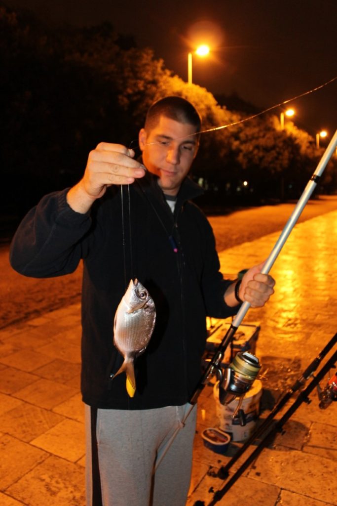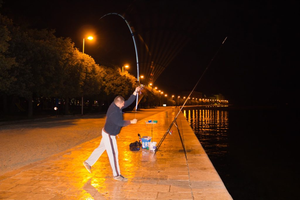 Lov sa obale svakako je drugačija tehnika od ribolova sa brodice jer zahtijeva konstantno zabacivanje koje se nekad čini i presudnim. Osobno jedan od dražih ribolova sa obale mi je upravo noću. Zajedno sa gore intervjuiranim ribolovcem Ninom Jukićem odradio sam trening sa zadarske rive. Ono što lov noću čini drugačijim od lova po danu je smanjena koncentracija sitne ribe koja najčešće samo pojede ješku. Noć je svakako i neizostavna za lov nekih “noćnih ptica“ poput: fratara, ovčica, orada, ugora i drugih. Na zadarskoj rivi gotovo da nećete uloviti fratra po danu, ako se i ulovi, to su primjerci od nekih 15-ak centimetara. Sačekali smo da se smrači kako bi izbjegli neumorne šetače po rivi. Za ješku smo koristili dagnju, koja nam je i ujedno i glavna ješka, te crva. U startu smo se opredijelili za tehniku sa dalekim zabačajima od preko 100 metara.