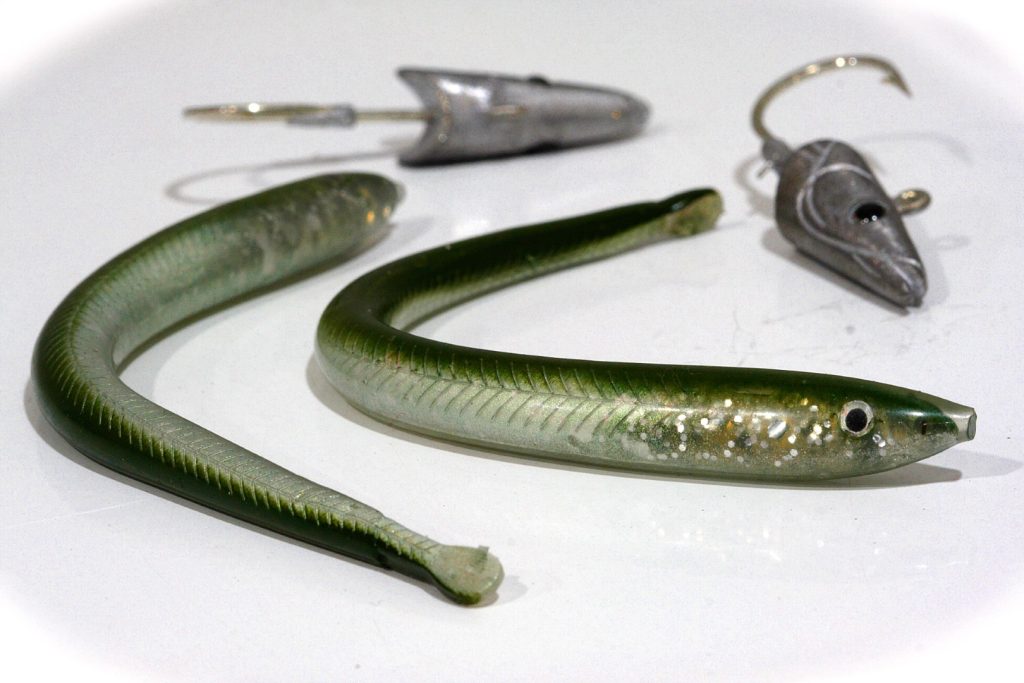 Između površine i dna, najčešće povlačimo plivajuće ili tonuće voblere sitnije akcije, duljine od 5 – 13 cm. Od manjih voblera favoriti su svakako Yo Zuri Pin`s od 5 ili 7 cm, Savage Gear Prey modeli, te brojni Maria, Megabass, Duo Lures, Lucky Craft, Sakura i mnogi drugi modeli. Svi vobleri provjerenih proizvođača koji podsjećaju na gavuna ili cipla i imaju izduženi minnow oblik mogu se sa povjerenjem koristiti. Neki vobleri (kao i silikonci) idu u duljinu i do 20 cm, što se čini predugačkim za naše brancine sa završenim fakultetom i bistrim morem, no optimalna duljina je od 7 – 12 cm i u tom razredu ima jako puno lovnih modela. Cijela serija Duo Lures voblera pod imenom Tide Minnow napravljena je za brancine, a i drugi proizvođači imaju široku lepezu ponude. Ono što bi bila preporuka kod lova silikoncima i voblerima je korištenje kvalitetne upredenice brandova poput Power Pro ili Gosen od odprilike 12 lb,uz obavezno korištenje fluorokarbonskog predveza debljne 0,23 – 0,30 mm, duljine 1 – 1,5 m. Upredenica omogućuje bolje čitanje situacije pod morem i detekciju griza, a fluorokarbonski predvez je teško vidljiv i u najbistrijem moru, što je sigurno poželjno ako želite prevariti ovako opreznog predatora. Vratimo se još malo na silikon i spomenimo jeguljice. Od tradicionalne klasike poput Raglou-a koji se uglavnom koristio kod panule, a rijetko kod ribolova sa kraja, razvijene su mnoge serije silikonaca koji oponašaju male jeguljice, koje su omiljena hrana svih brancina, pa tako i naših jadranskih. Savagear Sand Eels, Sakura Magic Eeel ili Storm Proeel testirani su diljem svijeta na brancinima i mogu se montirati na klasične jig udice sa olovnom glavom ili na posebne udice sa glavom jeguljice, koje se proizvode baš za te serije silikonaca.