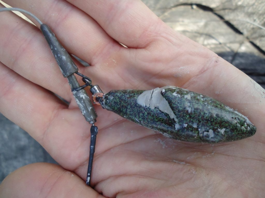 Na svim glinokopnim jezerima dobre se lokacije najlakše nalaze pomoću marker olova koja imaju specifičan oblik (na slici). Taj mu specifičan oblik pomaže da se lakše utvrdi najtvrđi dio dna, gdje se šarani obično hrane i izbjegne mulj. Na Šumbaru je to već poznata „žuta zemlja“. Jedan od najlakših načina da sigurno utvrdite da ste zabacili na pravo mjesto je kad ju nađete na svom sistemu, na ulovu ili samo na udici. Meni se ribolov u smrdljivom mulju nikad nije pokazao uspješnim i zbog toga ga uvijek izbjegavam. Mjesta gdje se šarani hrane obično su nalazišta njihove prirodne hrane, i kad ju oni iskopaju to je dno nešto tvrđe od ostatka, i mi ga ribolovci nazivamo tvrdim. Ako šarana lovite po danu maskiranje pribora je vrlo važan detalj. Teško je baš uvijek naći materijal za leadcore ili za predveze koji je identičan dnu jezera, pa je nekad dobro posegnuti za starim tehnika maskiranja predveza trljanjem glinom ili blatom s vode na kojoj lovite. Premda se kod zabacivanja i potonuća leadcore sistema dio gline ispere, dio još uvijek na njemu ostaje. Slično je i kod materijala za preveze bez tvrdih ovojnica, jer manje količine gline uvijek ostaju u onim najsitnijim porama.