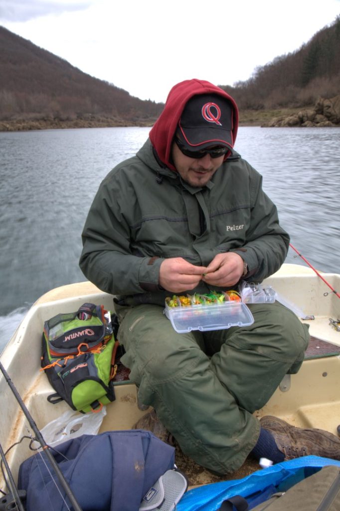 Nisam se niti okrenuo i jutro je bilo tu! Nebo je bilo boje… nije bilo nikakve boje jer smo već u pola pet ujutro jurili autocestom. Na pola puta smo uzeli „coffee to go“ i nastavili dalje ful gasom (po propisima naravno…). Kava se još nije stigla ohladiti a mi smo stali kupiti ribolovne dozvole. Nakon kratkog razgovora i par prikupljenih informacija, koje doduše nisu zračile optimizmom, krećemo prema vodi. Dok parkiramo, gledamo vodostaj koji je skoro četiri metra viši nego obično. Padaju prve kapi kiše, a mi se molimo da su ujedno i zadnje. Utješilo nas je to što vjetar nije jak jer jak vjetar zna komplicirati stvari. Nakon kemijanja po blatnom terenu relativno brzo smo spustili čamac i otisnuli se. Ni sam ne znam tko se od nas trojice prvi spremio ali u razmaku od pet sekundi svi smo uspjeli zabaciti. Taman komentiramo kako ovaj dio vode nije baš nešto, a ja osjetim one slatke trkce po jigu. Poluglasno kažem: „Dečki… imal’ sam nekakav griz…“, na što mi Ivan dogovara: „Ti si imao griz, a ja IMAM RIBU!“ Sva trojica smo se pogledali i tako je sve počelo. Prolazi pola sata i uočim da imam jednak broj grizeva kao ostali, no realizacija mi je barem 30% slabija. Ispod oka pogledam Ivana i odmah mi je sve jasno, na jigu je Sakurin Slit Shad. Aaaaaa, u tom grmu leži zec! Iz svoje kutije vadim Awarunu sličnih dimenzija, montiram na 10 gramsku jig glavu i zabacujem. Trkac, kontra, riba! Sve je jasno, danas je bitan okus. Nakon što smo se svi upisali nastavili smo se spuštati koritom nizvodno. Po prvom očitanju sonara znali smo koje će pozicije „igrati“ taj dan pa smo tako brže prolazili pozicije koje nisu obećavale. Upravo na jednoj takvoj „lošoj“ poziciji Fabijan opali kontru, riba odmah dobro zapumpa i uslijedi dobar dril. Ni sam nije znao što očekivati jer je riba silikonac pokupila dosta visoko iznad dna. Lijepi klen na površini je pokazao da „loše“ pozicije i nisu baš toliko loše! Nastavljamo se spuštati i lijepo loviti. Grgeči su u prosijeku oko 0,3 do 0,4 kg, ali zato pružaju iznimnu borbu kad ih dižemo sa velike dubine. Budući da grgeče dižemo sa dubine drilamo ih sporo kako im ne bi iskočio mjehur. Kada su se grizevi polako prorijedili, montiram dropshot. Vežem fluorocarbonski predvez kako bi mi udica ispravno stajala vrhom okrenuta prema gore. Na tanku udicu širokog luka za sam vrh glave ubadam broj manji silikonac od Awarune.