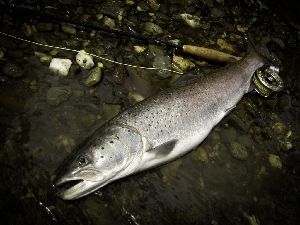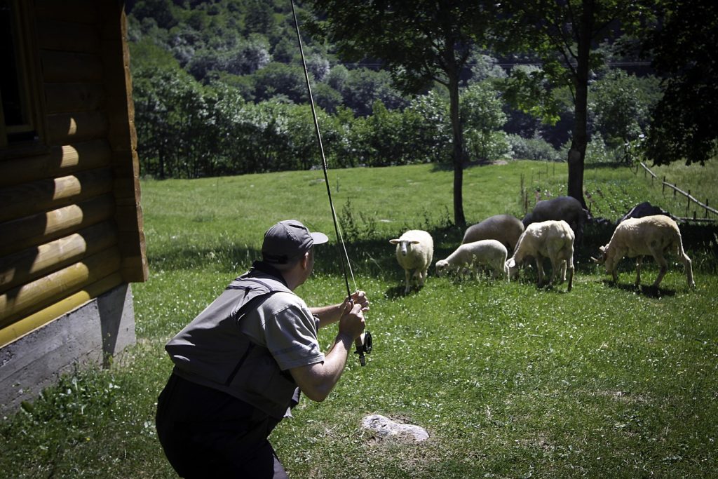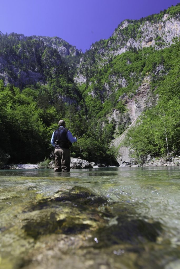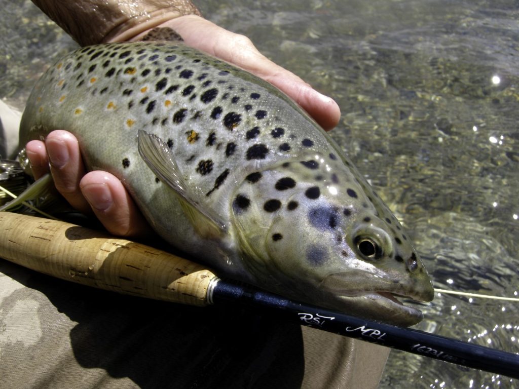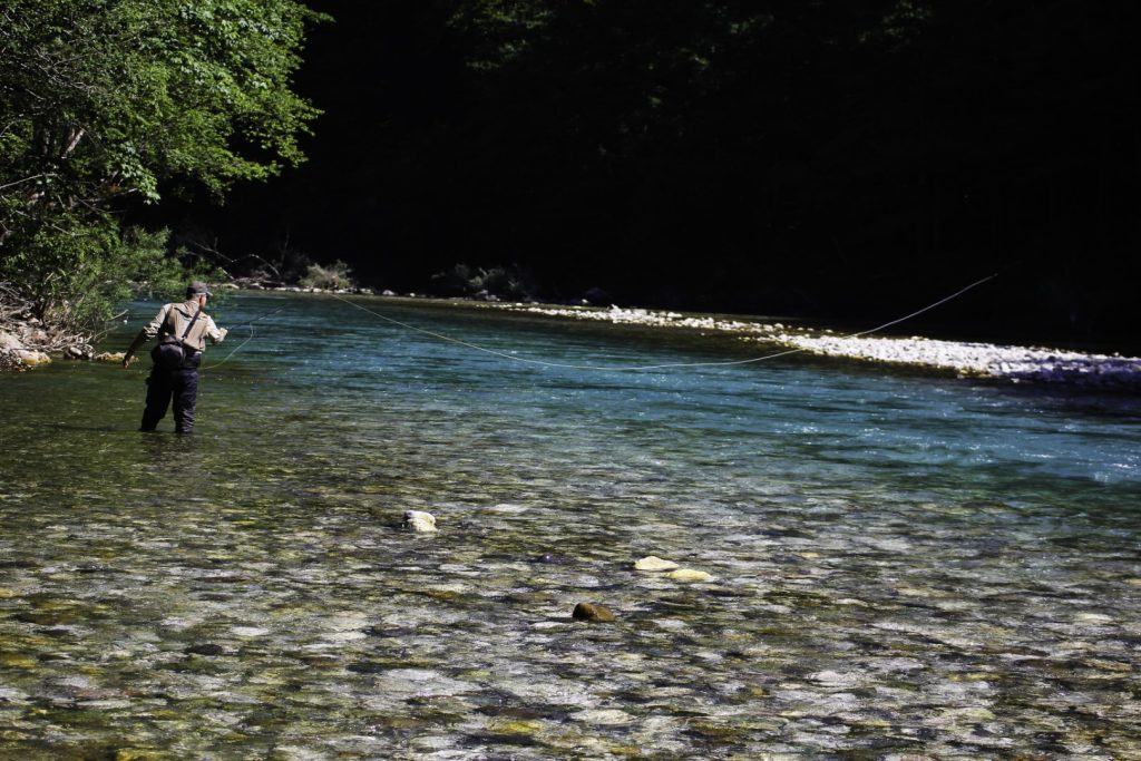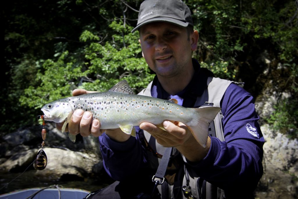 Nije prošlo dugo i hvatam prvu potočnu pastrvu od oko 35 cm. Zbog svijetlog kamenja riba je također svijetla sa velikim crnim i crvenim točkama – prekrasna riba. Iako smo se cijelo vrijeme prepucavali na relaciji špineri-mušićari, nakon nekoliko pastrva uspjevam nagovoriti jednog od glavnih dizajnera Scierre da se nabacuje leptirom br 5.