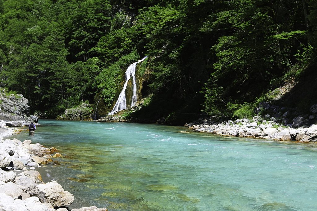 Zadnji popodnevni ribolov uzimam svoj špiner i penjem se na jednu visoku stijenu ispod jednog slapa na kosini dubljaka i plitkog platoa sa krupnim kamenjem. Po pričanju Velibora to je idealna lokacija za mladicu koja predvečer izlazi na hranjenje. U sumrak stvarno i vidim jednu od oko 70 cm sa visine, međutim dok sam promijenio mamac nestala je. U sljedećih nekoliko zabačaja mi za strimerom navezanim na jig glavi dolaze čak dvije u paru.