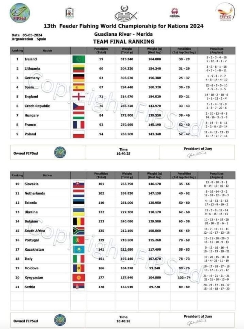 Što se tiče ovogodišnjeg svjetskog prvenstva Španjolsku će pamtiti Irski predstavnici. Irci su osvojili naslove svjetskih prvaka i u ekipnoj i u pojedinačnoj konkurenciji. Irska reprezentacija je slavila s 59 osvojenih bodova. Prvog dana je imala sektorsi skor: 5-2-3-4-16, a drugog: 5-12-4-1-7. Za petama su im bili upravo Litvanci koji su u konačnici osvojili drugo mjesto na svijetu i Nijemci, koji su na kraju bili treći. Domaćini, Španjolci su osvojili četvrto mjesto, a favoriti Englezi morali su se zadovoljiti petim. Englezi su, što se tiče rankinga i broja osvojenih medalja na dosadašnjim svjetskim prvenstvima najtrofejnija svjetska reprezentacija sa 13 ovojenih odličja, osam ekipnih i šest pojedinačnih. Njihova prva udica Steve Ringer bio je i najbolje plasirani pojedinac engleske vrste sa šestim osvojenim mjestom na svijetu. Ringer je prvog dana bio drugi, a drugog četvrti u sektoru ukupno ulovivši 81210 grama ribe.